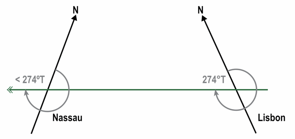 Example 1: Given that the initial great circle track from Lisbon (38°N 009°W) to Nassau (25°N 078°W) is 274°(T), find the final great circle track.