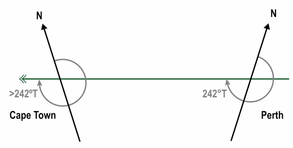 Example 2: Given that the initial great circle track direction between Perth (32°S 116°E) and Cape Town (34°S 020°E) is 242°(T), find the final great circle track.