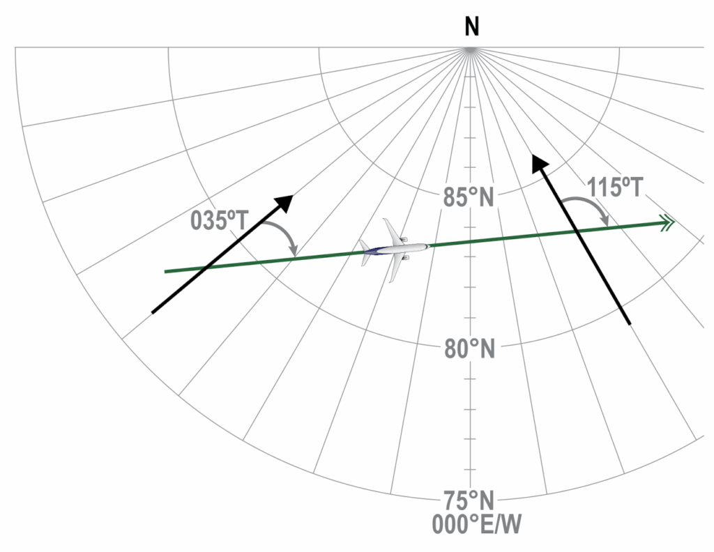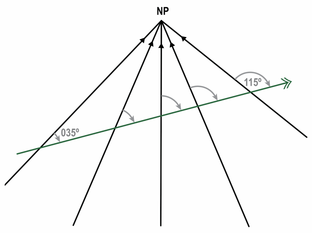 Direction is measured as an angle from a datum (reference point). In navigation, the datum is a single point, the North Pole. The meridians, the local north, converge into the pole. Because of this, straight lines drawn on the Earth have different directions along their track.