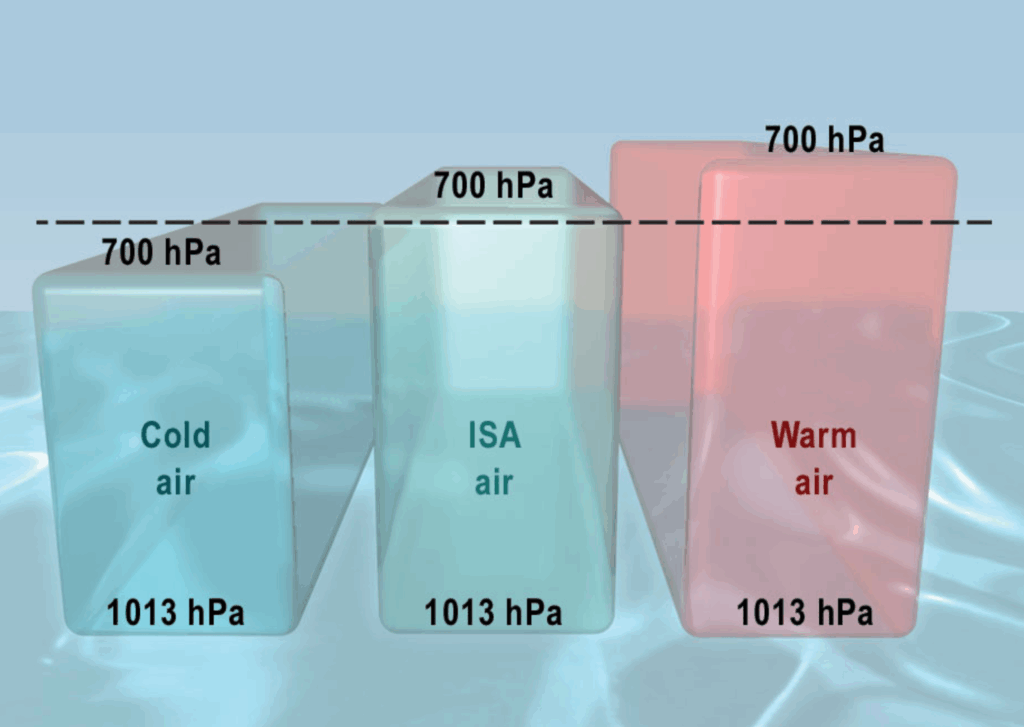 In high temperature air masses, any given pressure level will be at a greater altitude than in cold air masses.